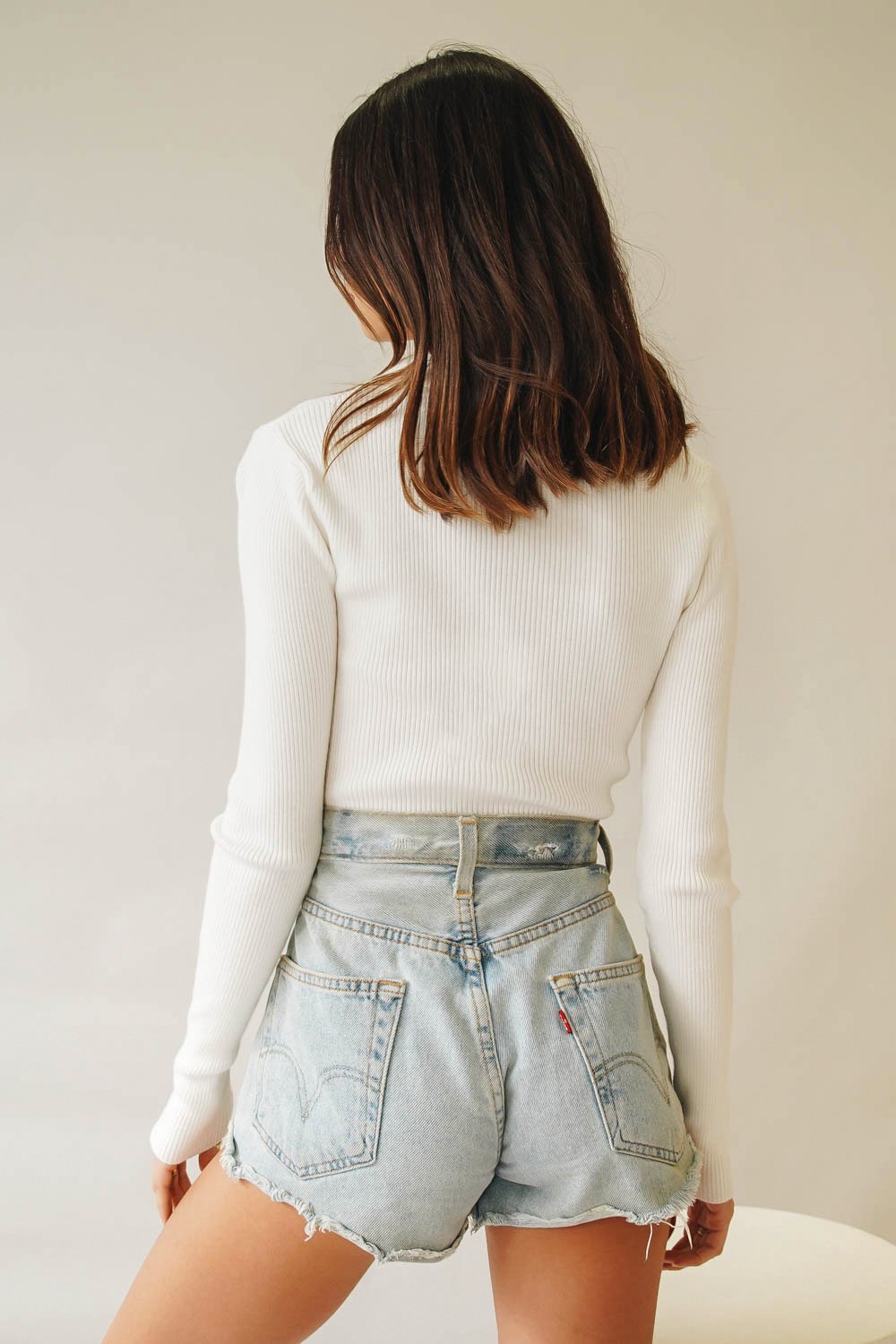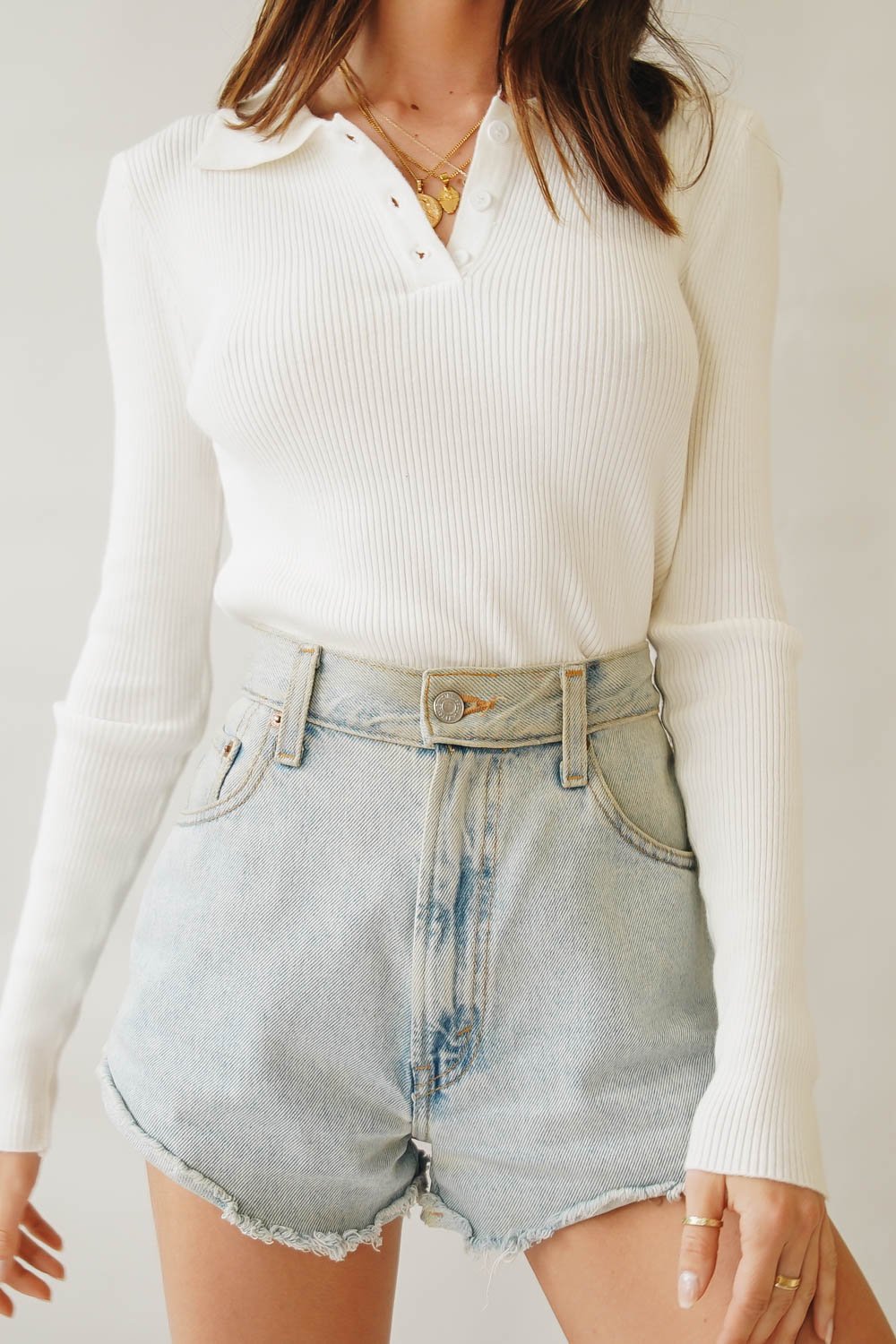 Neutrals Always! Effortless yet chic featuring centre front buttons, this knit top looks effortlessly cool paired with a mini skirt & neutral boots or mules.