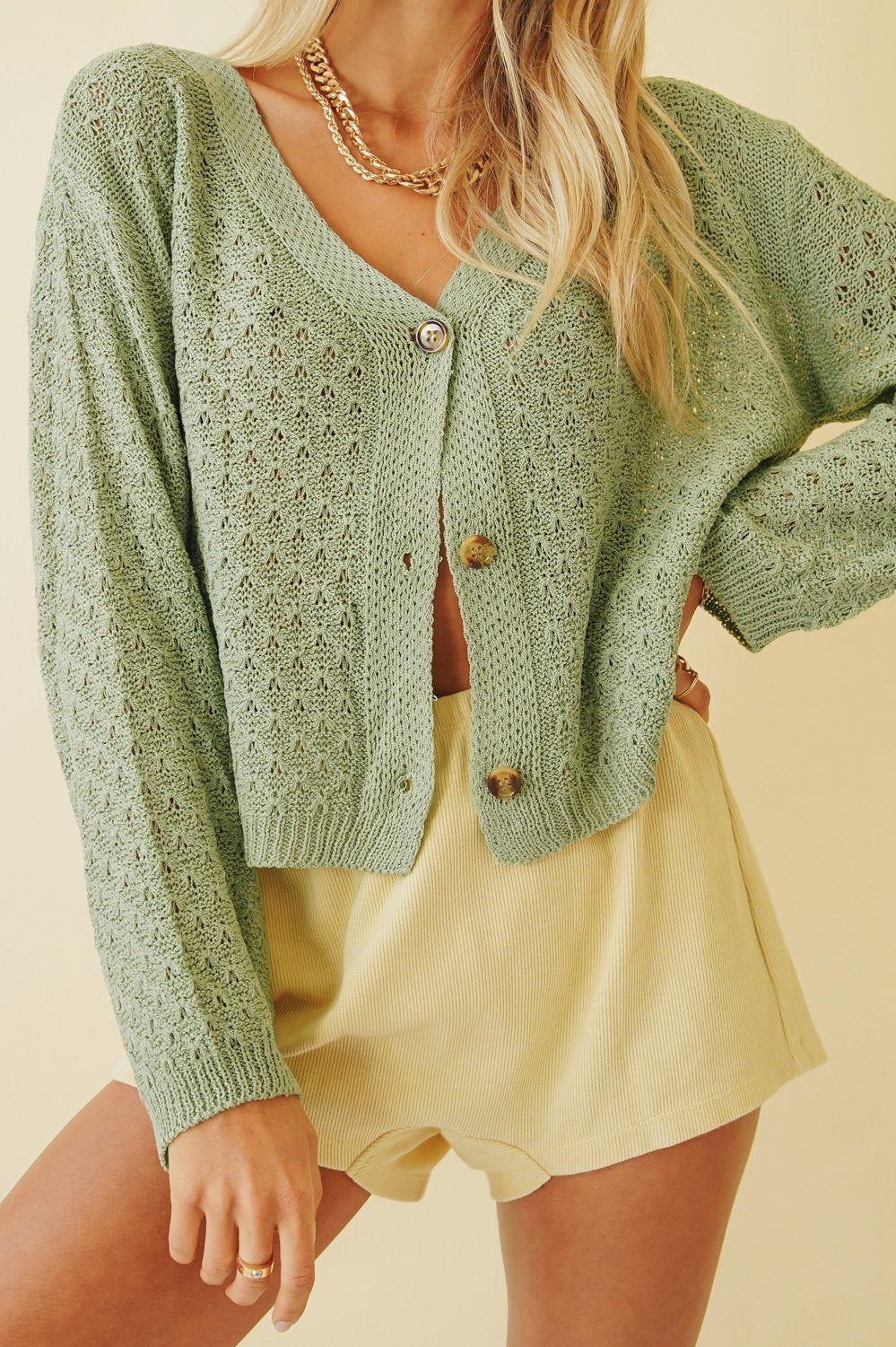 We're always dreaming of Paris... and this knit top is making us feel like total French girls. Effortless yet chic featuring centre front buttons & a crochet fabric, we are styling this with vintage shorties & tie up mules for brunch at your fave cafe! Also available in White.