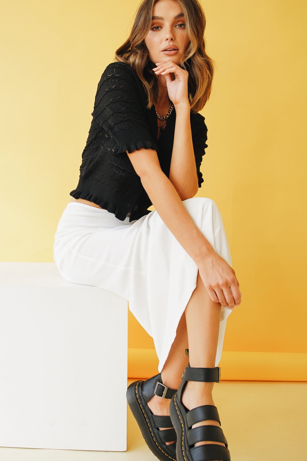 Effortless & Chic. Made from a stretch, ribbed knit fabric, this easy wear number is the perfect go-to for a weekend spent with your best girlfriends! Pair with your fave mini skirt & strappy mules for a look we love! Also available in White.