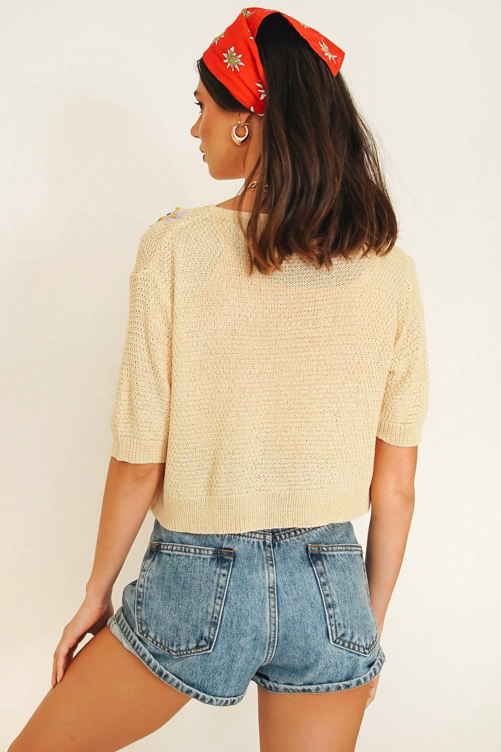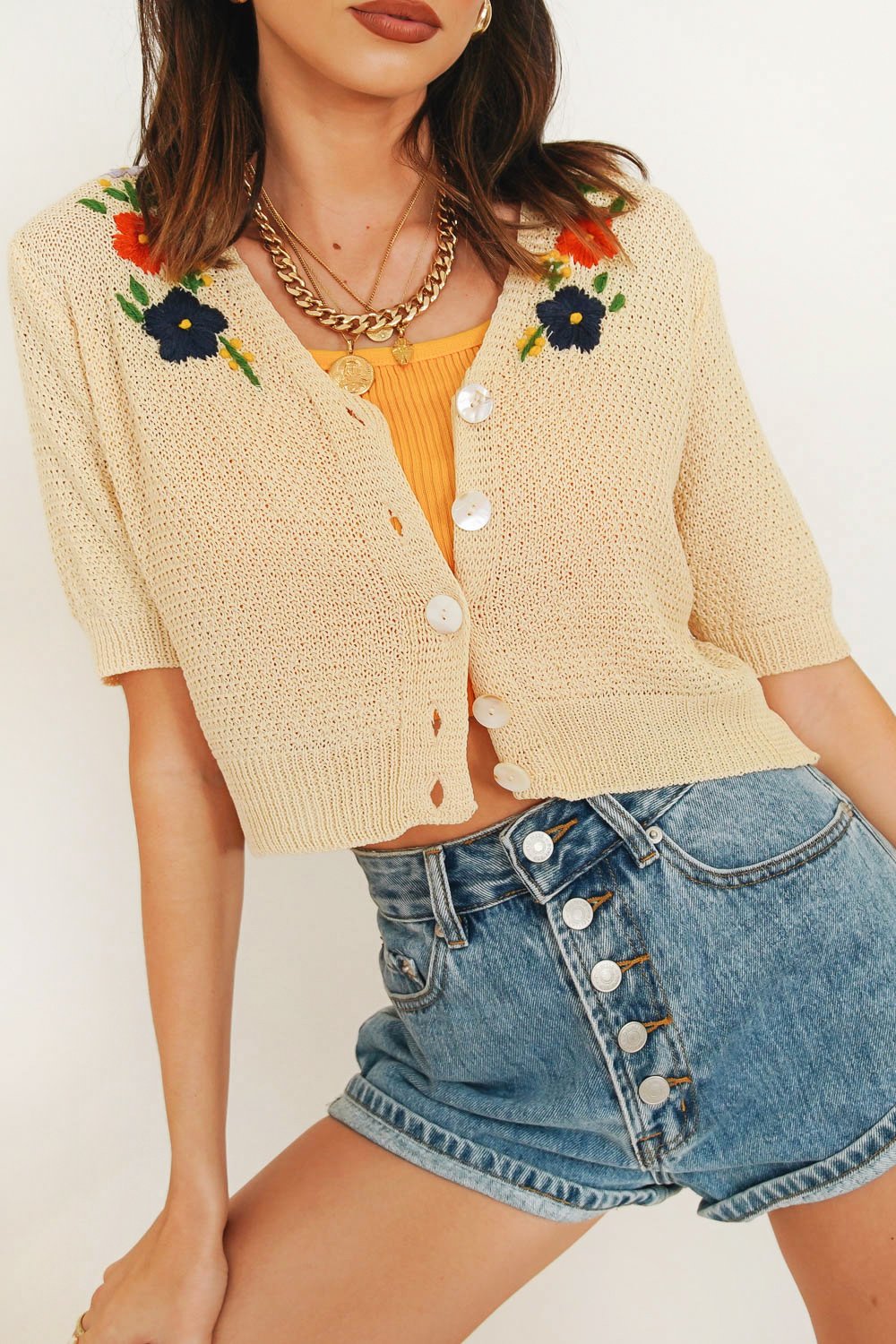 Wake up late & slip into your new fave knit top for brunch at your fave cafe. With a button up front & floral embroidery, this baby is perfect styled with vintage denim or your fave linen mini skirt. Also available in Lilac & Lemon. Please note top worn underneath is not included.