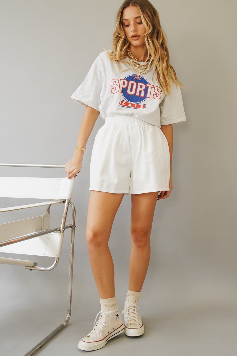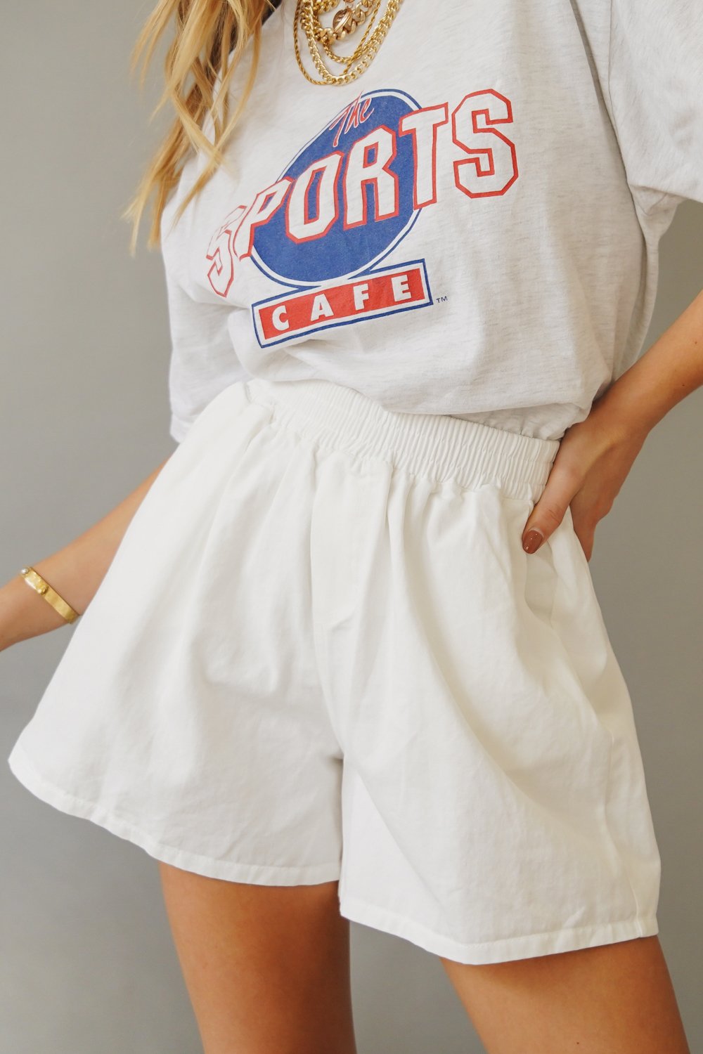 Comfort + Effortless Cool! We're styling our easy wear Strolling Down Los Angeles Shorts with our fave vintage tee & sneakers for a go-to weekend look! Also available in Lilac.