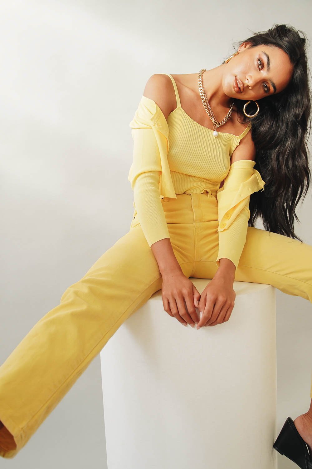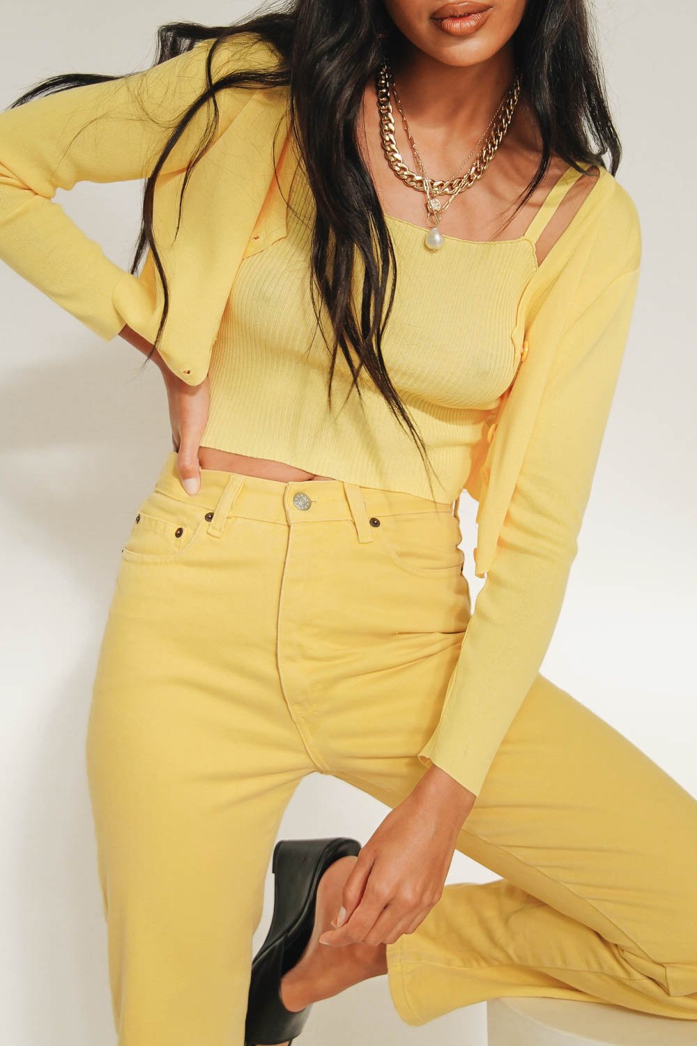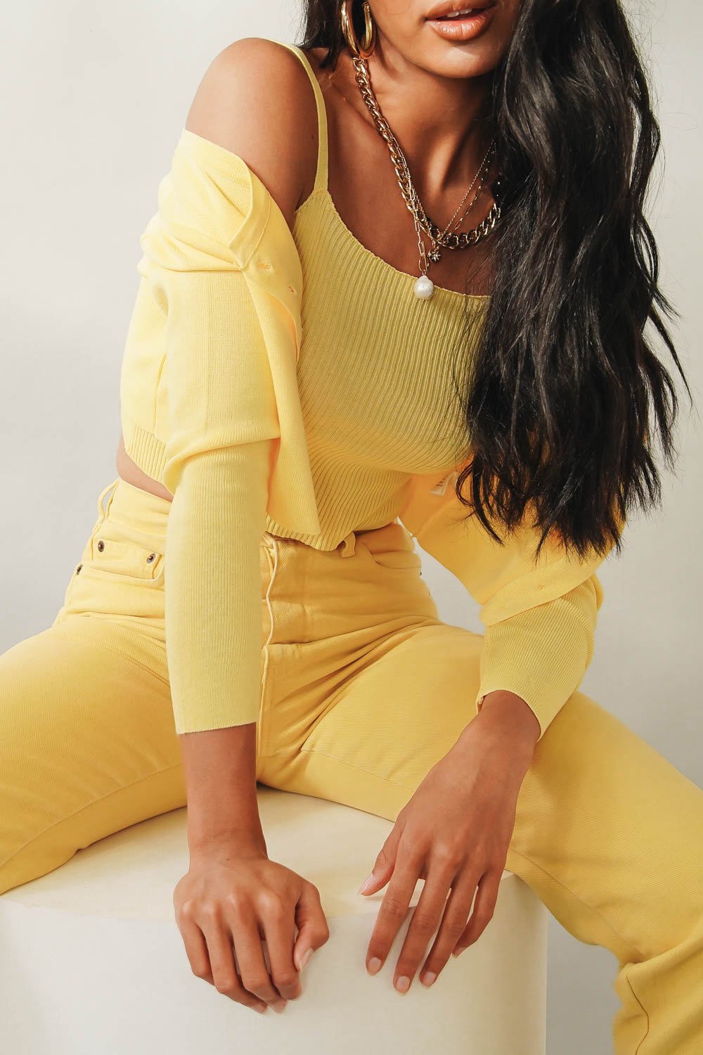The ultimate chic street style look! Our New Attitude Knit Cardi Set is made from a soft ribbed fabric & includes both a cami & button front cardigan - Wear them together or separately, paired with vintage denim for a look we love! Also available in Lilac.
