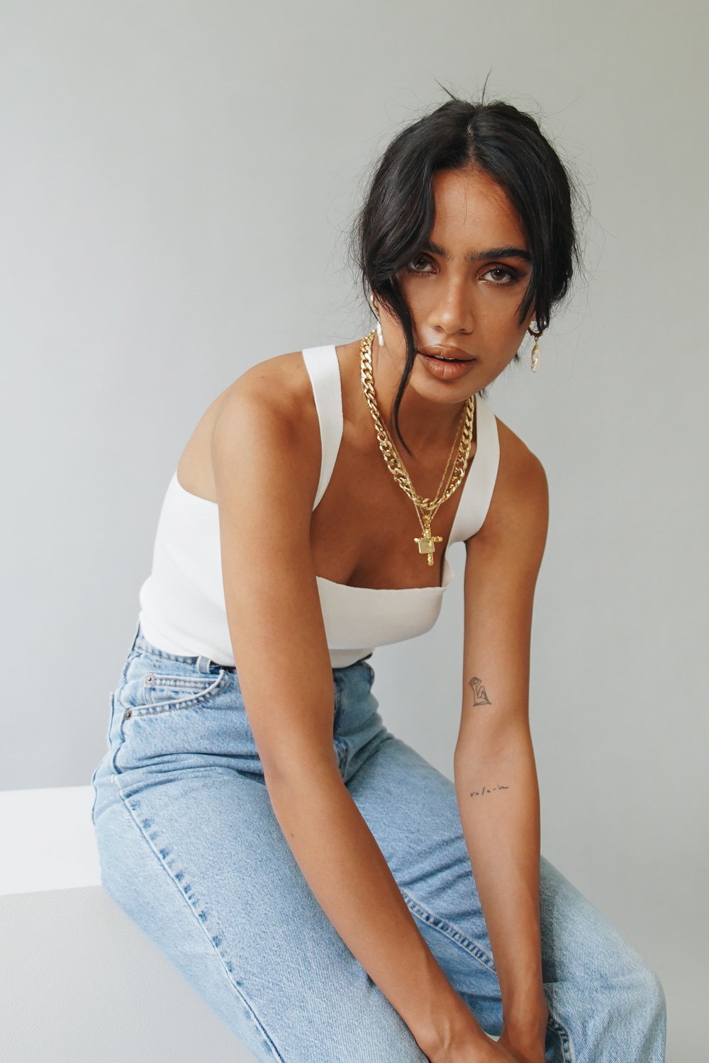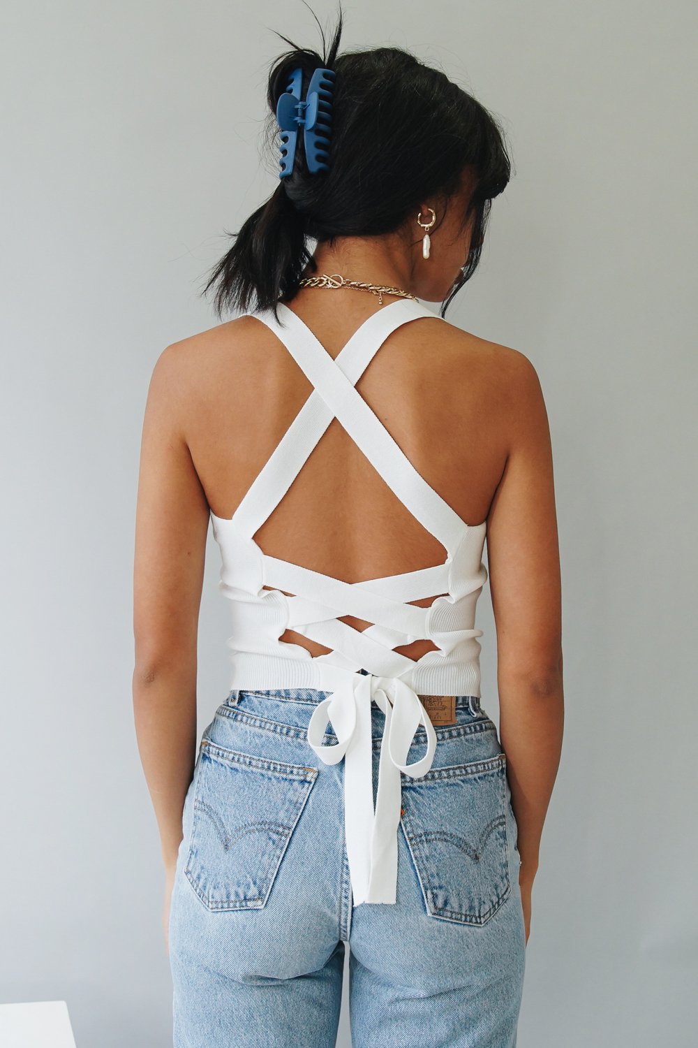 Turn heads in our Everybody Dance Top! This knit number features a tie back & is made from a soft stretch fabric. Pair with vintage denim & 90's style mules for a total cool girl vibe! Also available in Black.