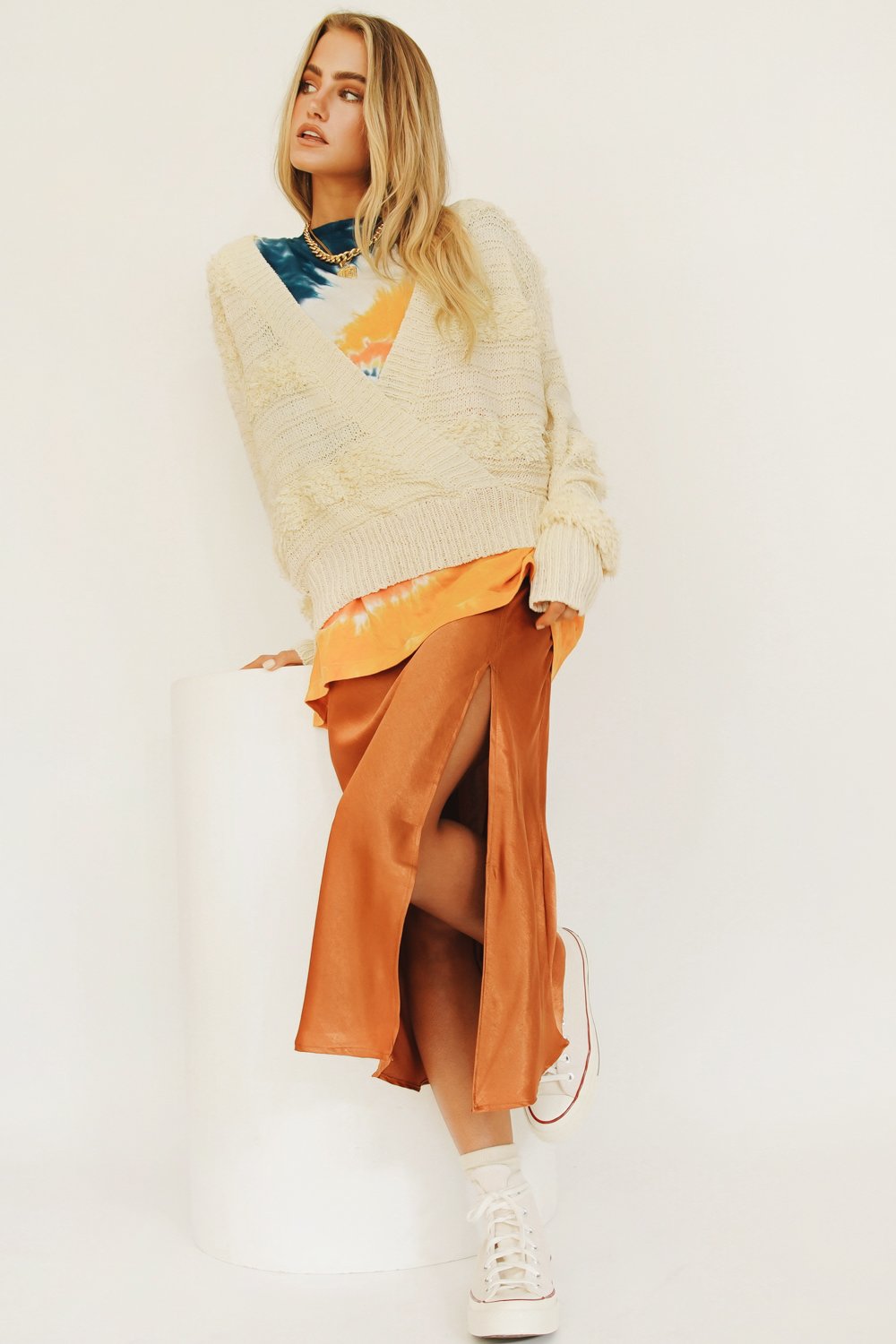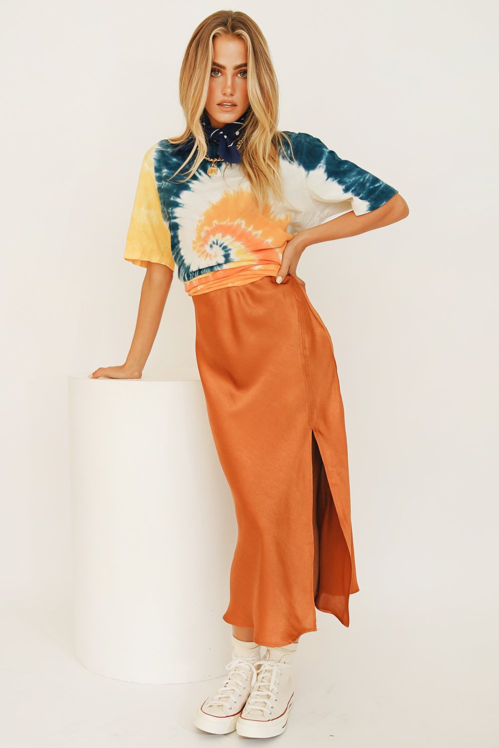 For Sundays spent at your fave cafe... Featuring an elastic waist, front split & cut on the bias fit, this midi skirt will let your hips do all the talking! For a look we love, wear with a vintage tee & your fave sneakers.