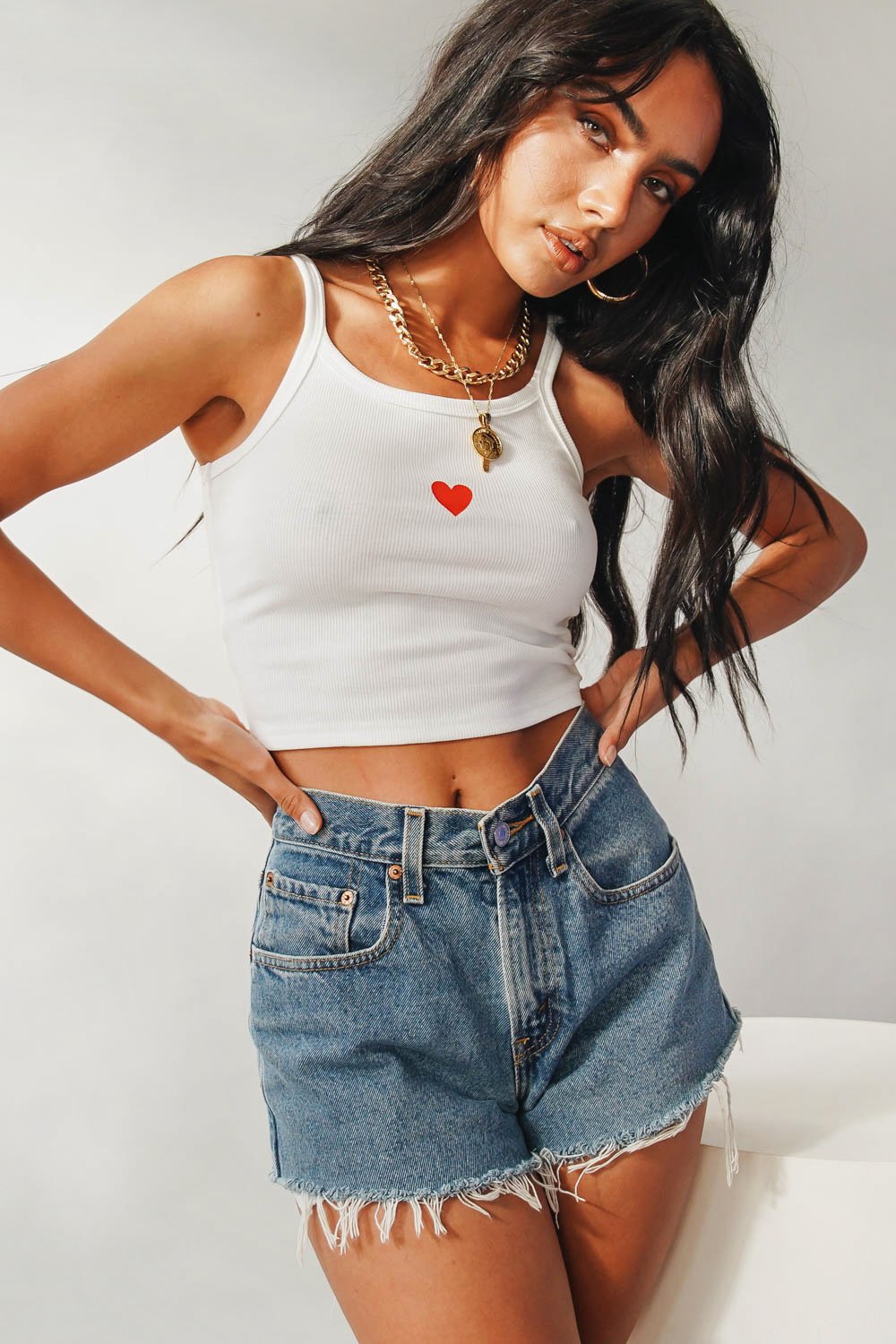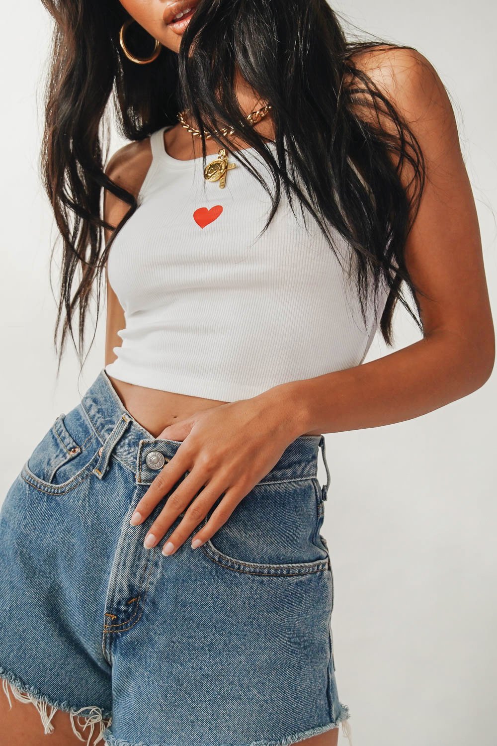 Step Back Into The 90's... This ribbed top is giving us total nostalgia featuring a centre front heart detail - We're wearing this number with vintage denim & strappy mules for a go-to weekend look!
