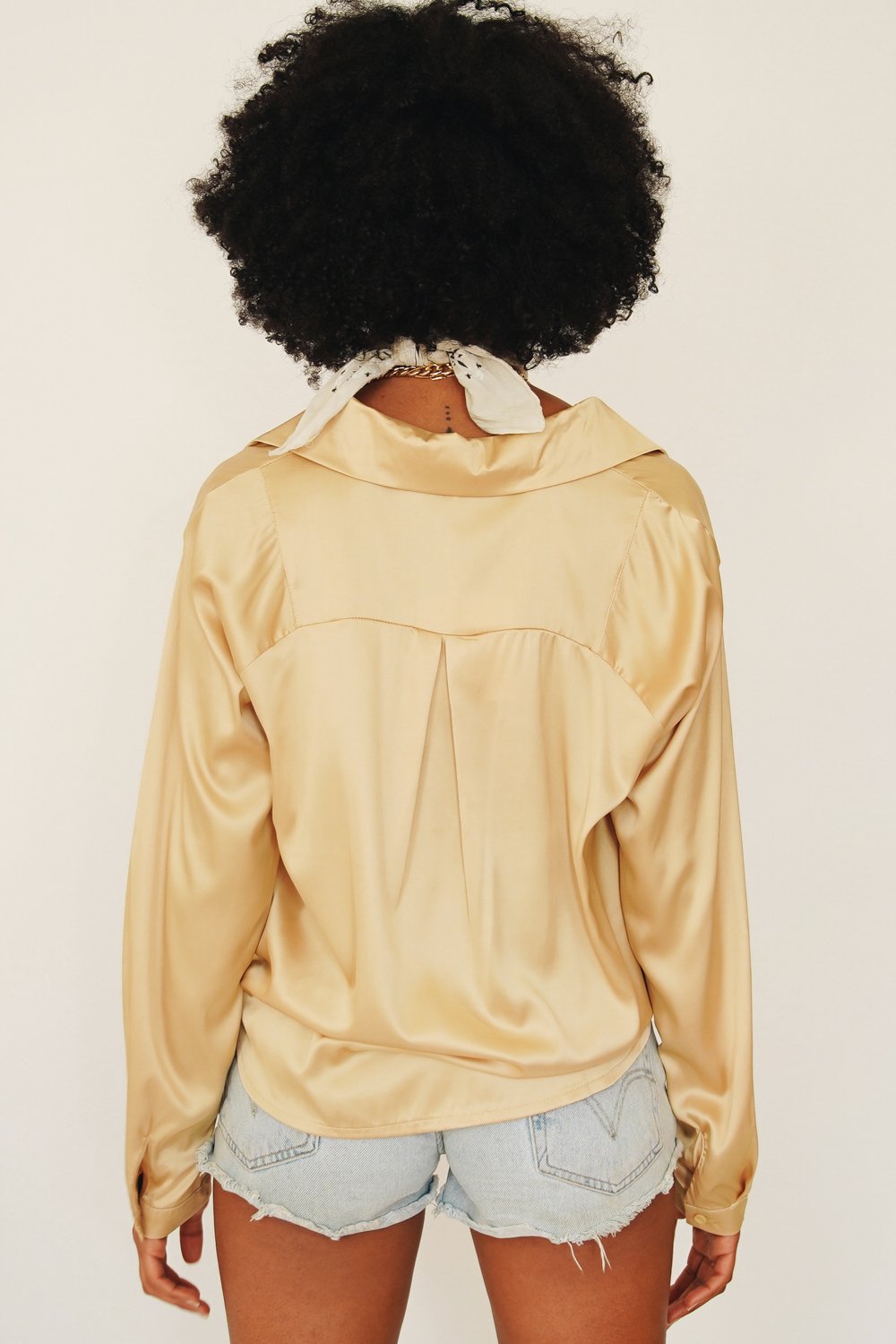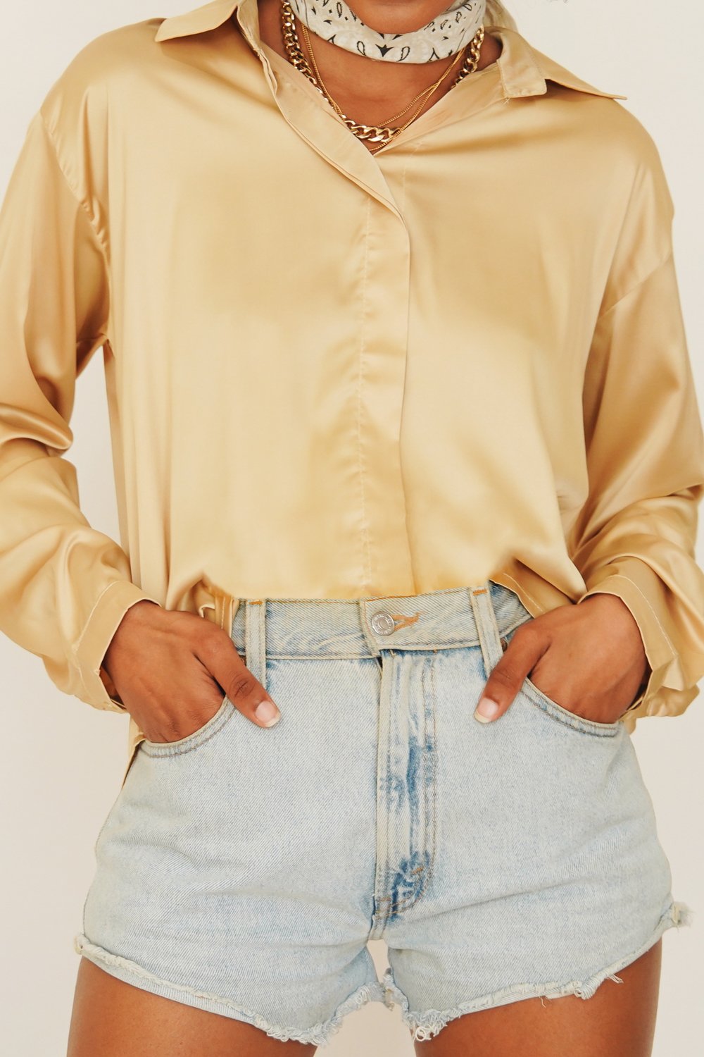 Femme, chic & off-duty Carrie Bradshaw all sewn into one silky number. Let this button front shirt do all the work for you. Our Of The Night Button Front Shirt makes getting dressed easy, perfect styled with vintage denim & mules! Also available in Black.