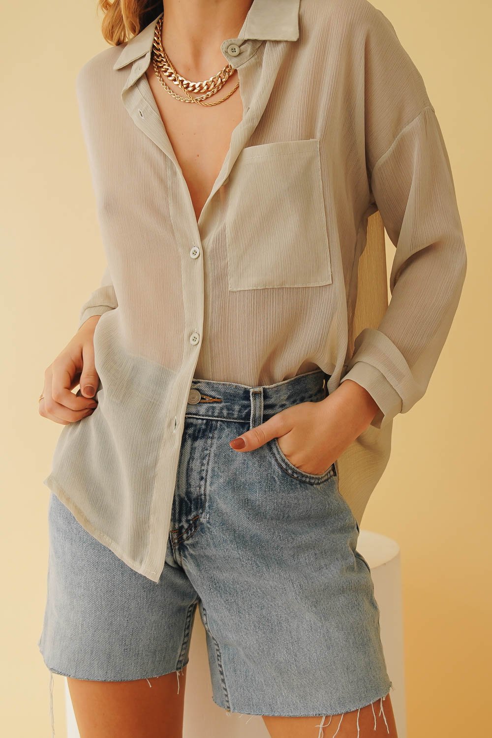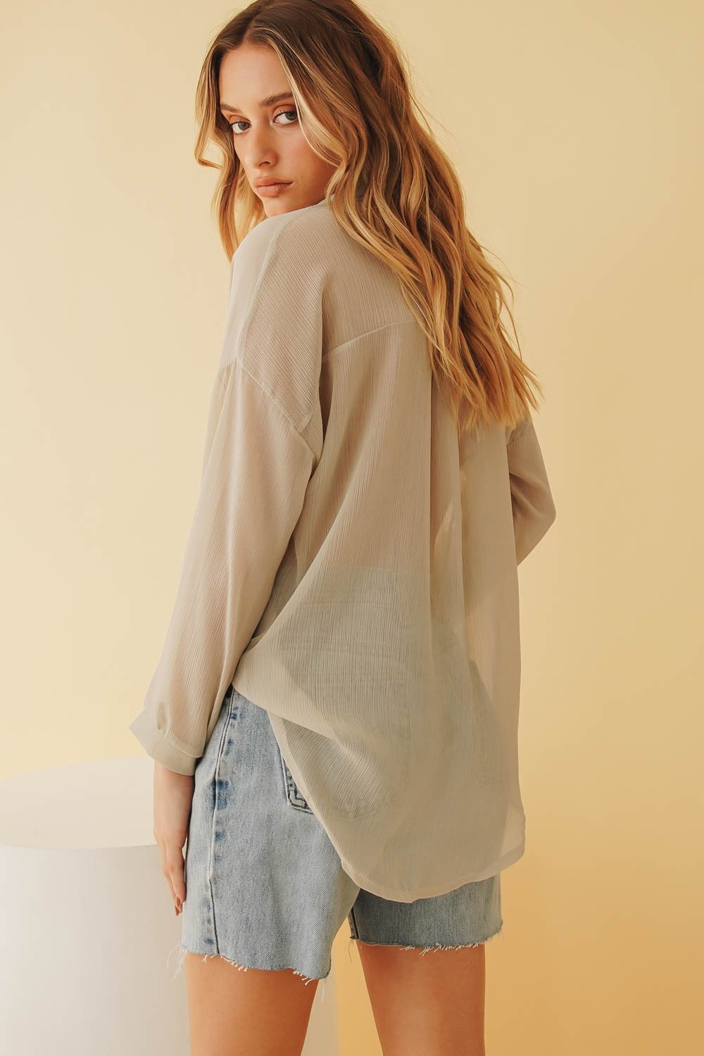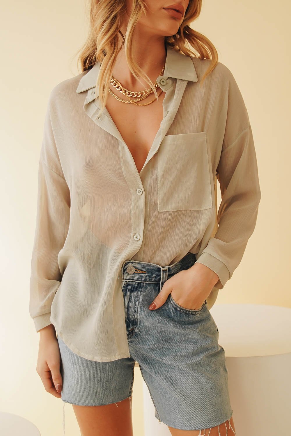 From weekdays to weekends - this is an everyday number! Made from a sheer fabric, this button front number looks effortlessly cool styled with vintage Levi's & tie up mules for afternoon cocktails with the girls! Also available in Rose. Please note tank top worn underneath is not included.