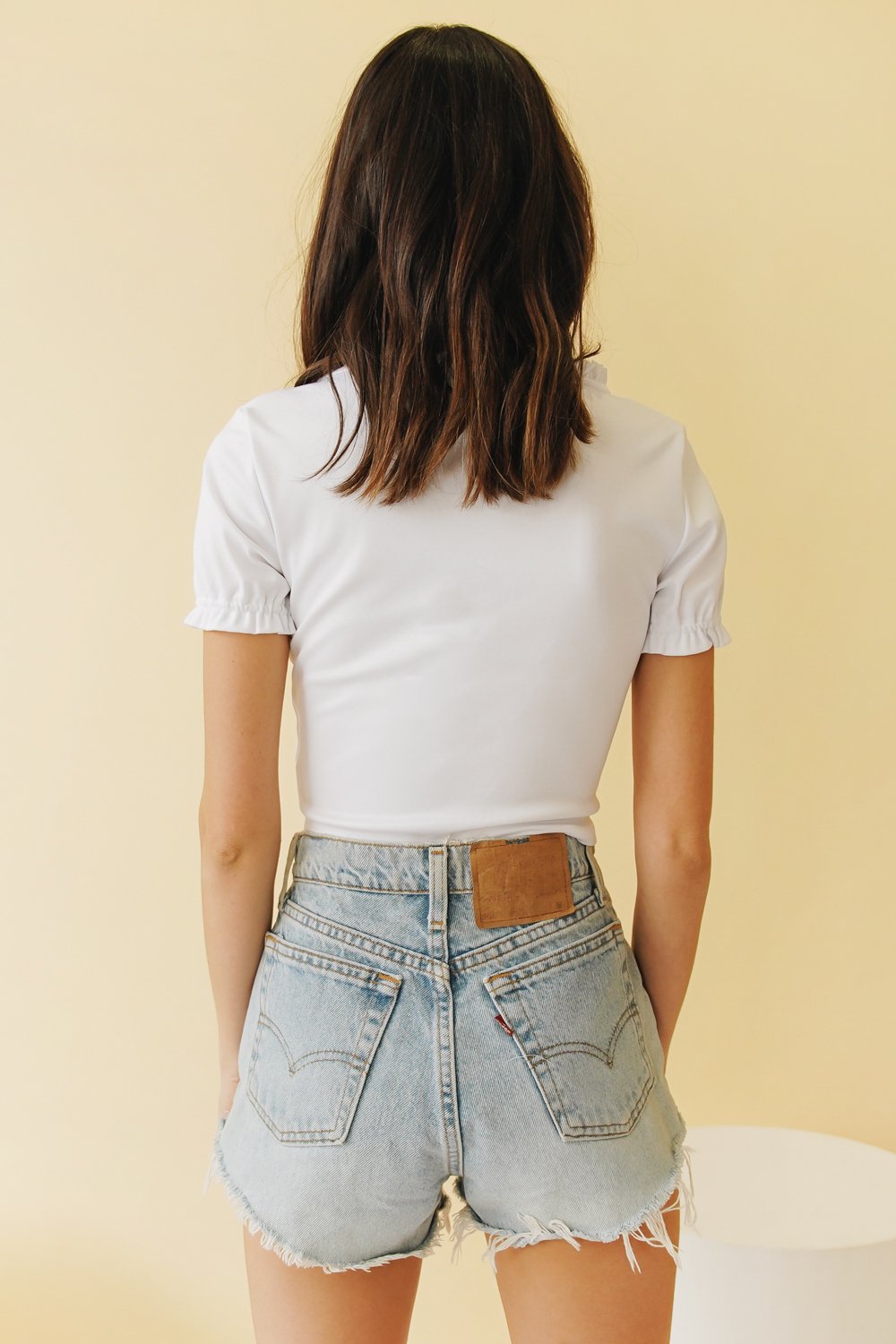 N.Y Street Style. Our Model Top features a tie up front & elastic sleeves - it looks so cool styled with vintage denim & 90's style mules. Trust us, you'll be unforgettable in this one!