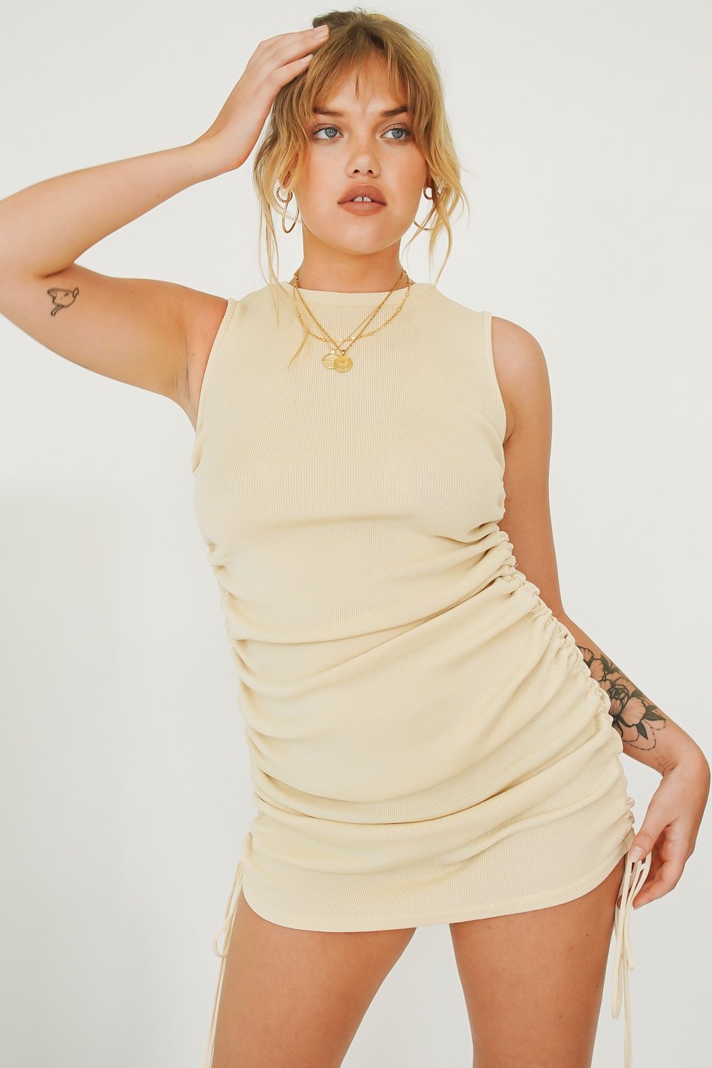 Chic Street Style Vibes! Feel femme & chic in our Beauty Game Drawstring Mini Dress, so cool styled with your fave 90's mules & gold layered accessories! Also available in Sage, Sky, Chocolate & Black.