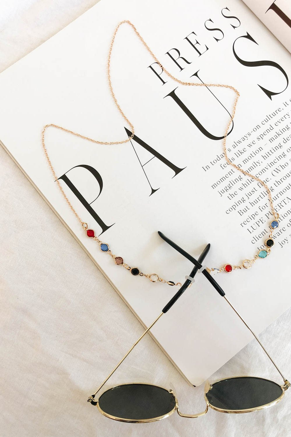 Cool & Chic. This gold & gem detailed sunglasses chain looks so cool paired with your fave sunnies for a layered look. Please note sunglasses are not included.