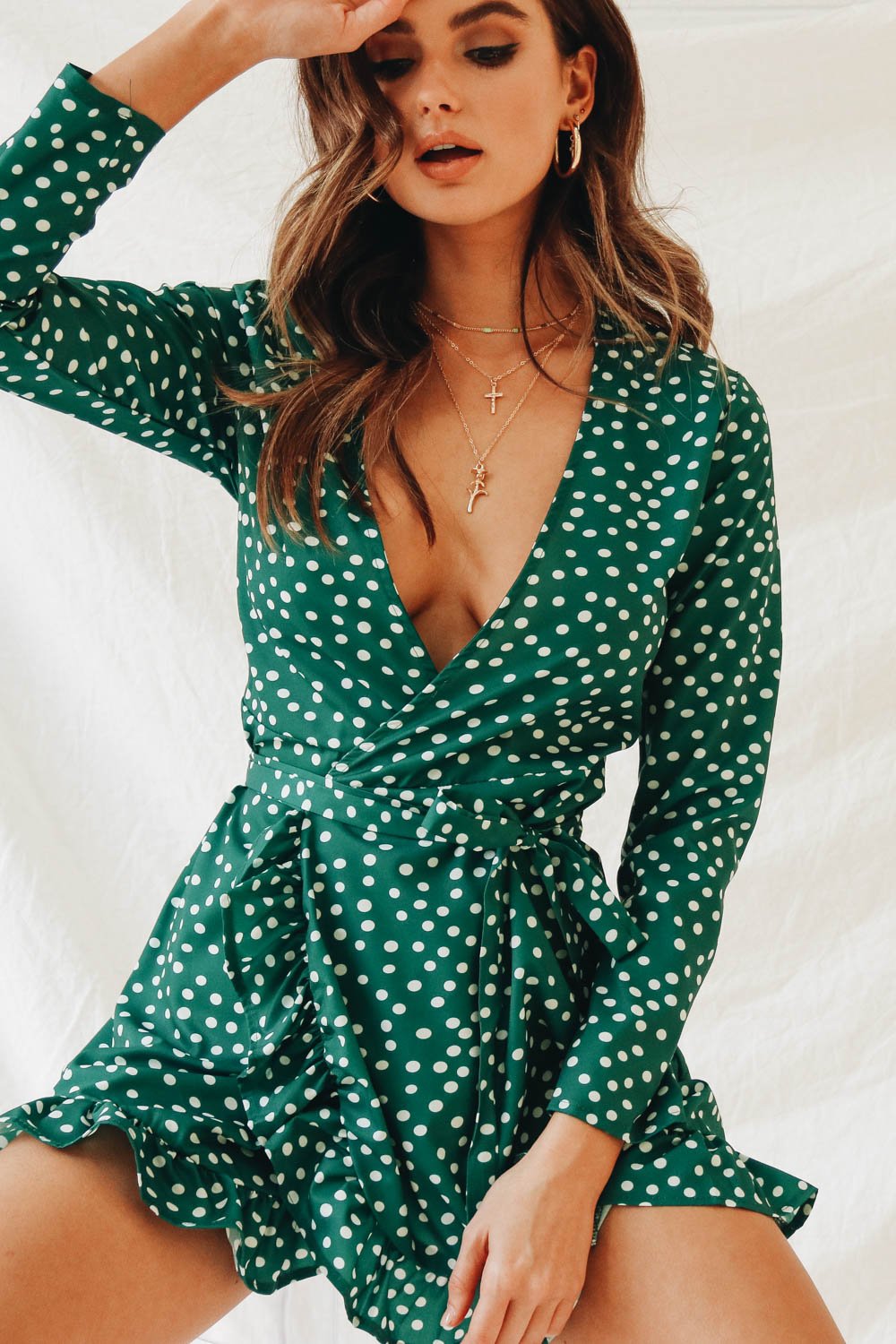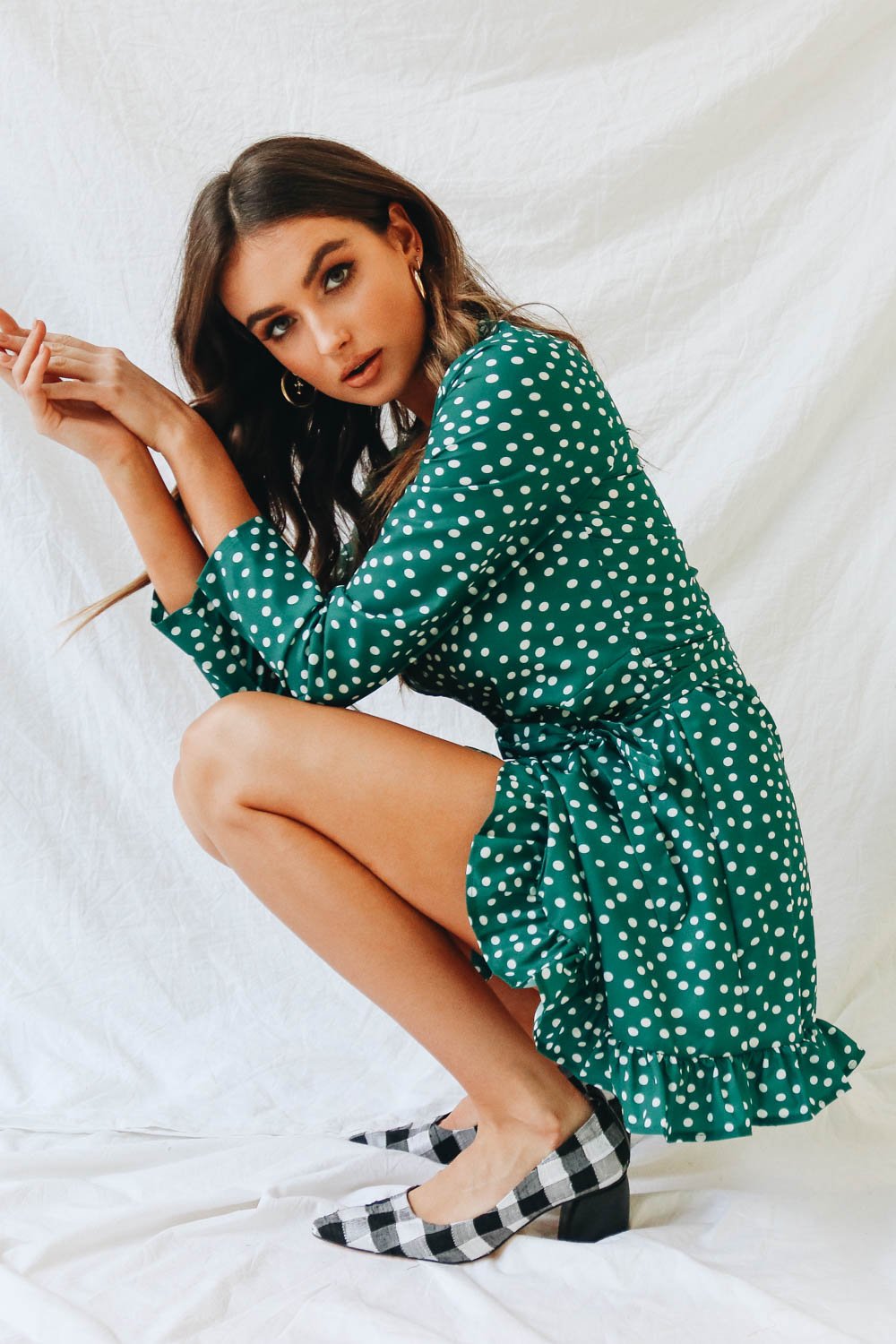 • Load image into Gallery viewer, Downtown Studio Wrap Mini Dress // Emerald