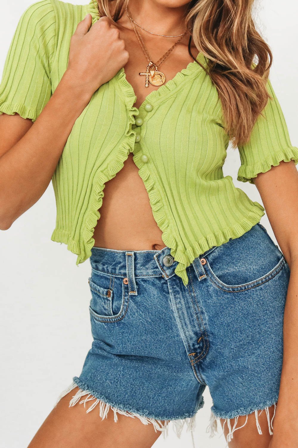 - Featuring a button up front & frill detailing