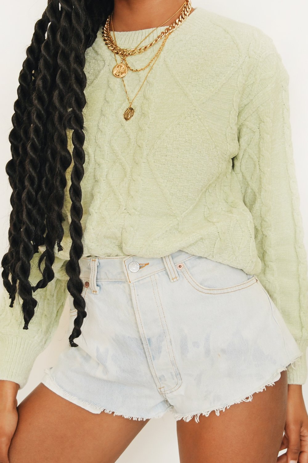 For weekend mornings spent at the markets with the girls... Our Play It Cool Knit looks effortlessly chic worn with vintage Levi's & sneakers! Also available in Lemon & Natural.