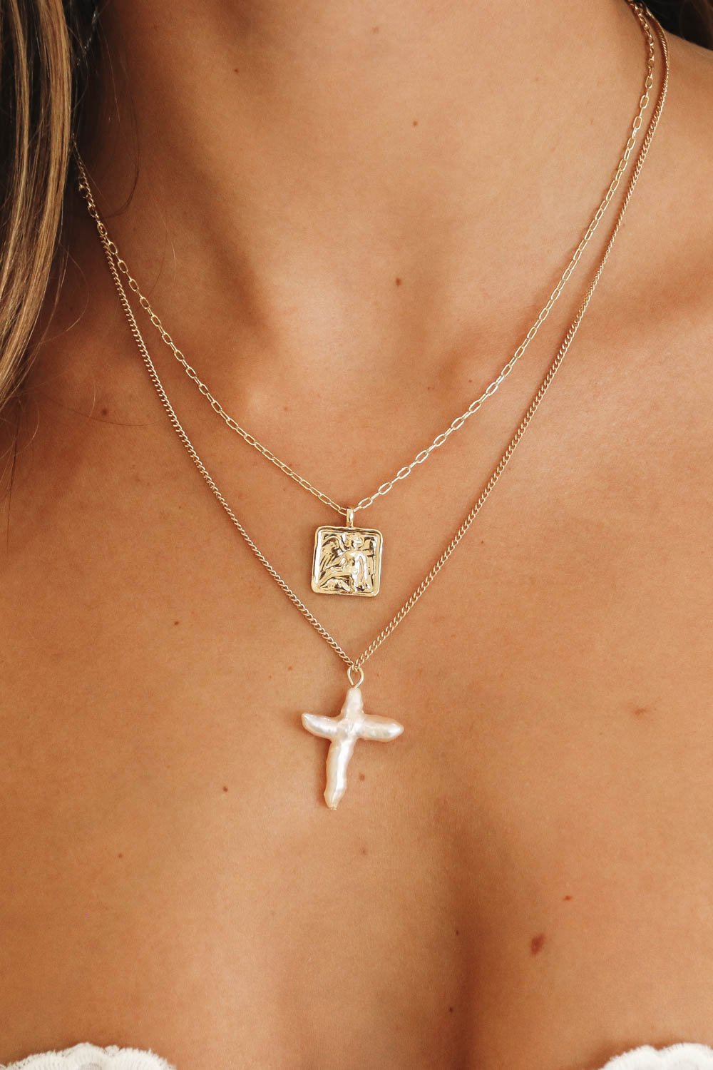 Gold Luxe. Style this gold necklace with your go-to linen button up shirt & mini skirt for a femme feel.
