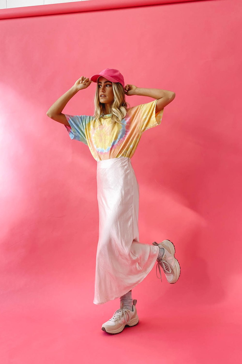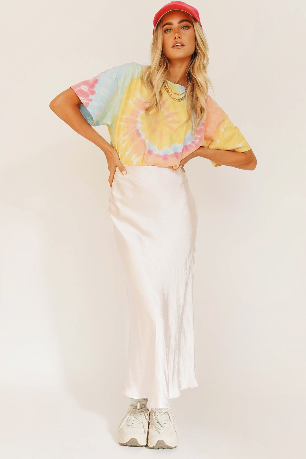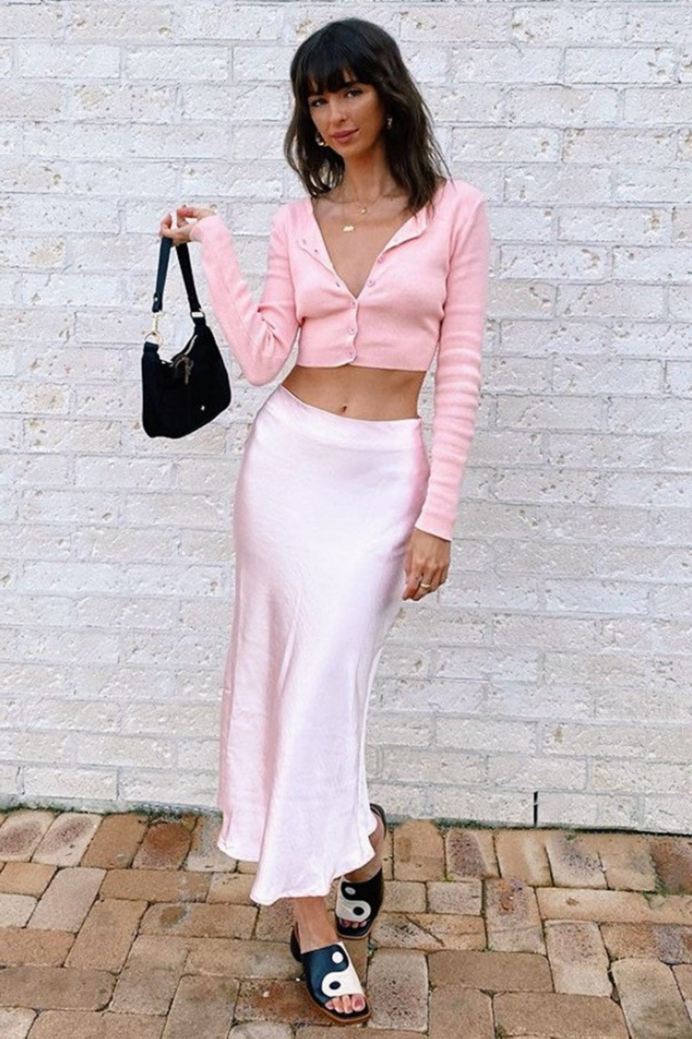 For a night spent sipping cocktails with the girls... Featuring an elastic waist, side zip opening & a cut on the bias fit, this midi skirt will let your hips do the talking! For a look we love, wear with a neutral crop & tie up mules.