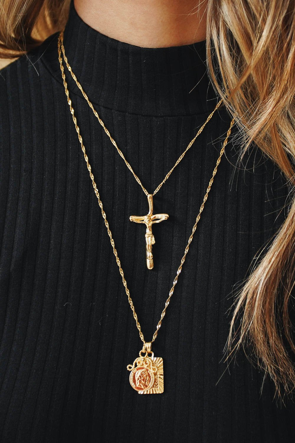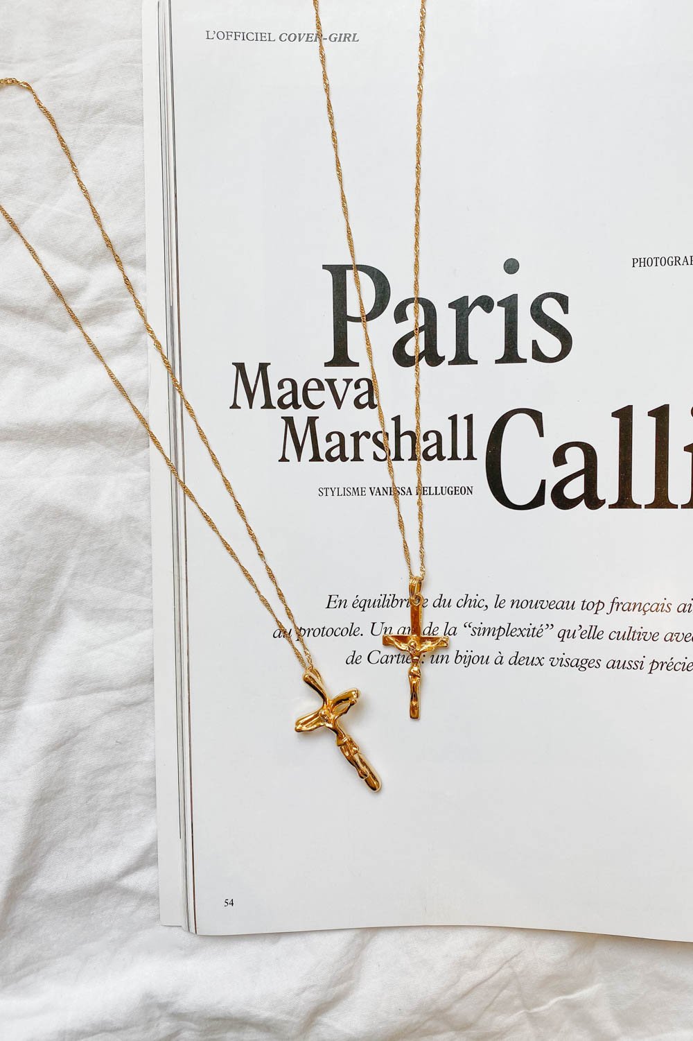 Golden Hour. Our Written For You Cross Necklace looks so cool styled with a mini dress & woven mules for balmy afternoon drinks.
